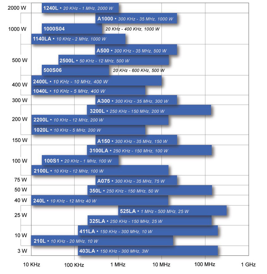 Our amplifiers cover frequencies from 10 kHz – 500 MHz, with power levels ranging from 10 – 2,000 Watts.
